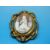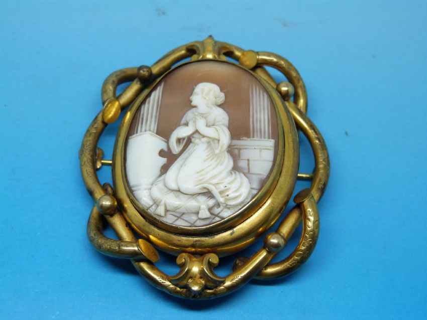 A yellow metal and carved shell cameo brooch depicting a kneeling women with swivel mechanism to reveal a glass side (mourning brooch) inside a scrolling surround