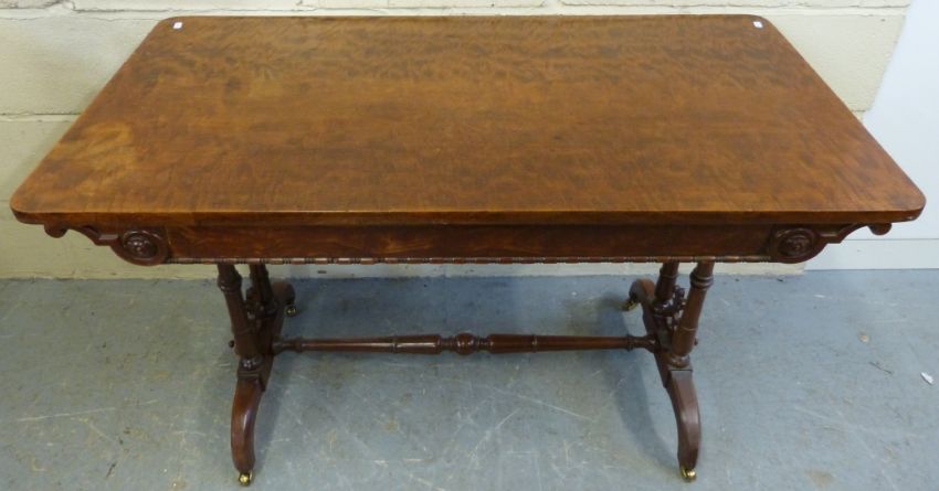 A Victorian mahogany and satinwood sofa table raised on four turned columns united by a turned and tapered stretcher (length 115cm, width 61cm, height 69cm)