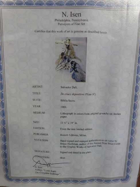 Salvador Dali: Lithograph "De Cruce Deposition" plate 97 with certificate stating that the item is authenticated by Bruce Hochman (48cm x 34cm)