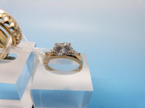 Two 9ct gold rings, one depicting a water lily (size Q), the other with a textured surface (8.2g) (size O/P), together with a yellow metal ring marked 14K set with cubic zirconia (size Q)
