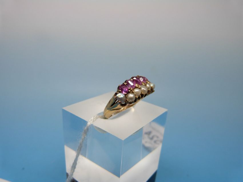 A Victorian yellow metal ring set with a row of rubies and a row of seed pearls (size K)