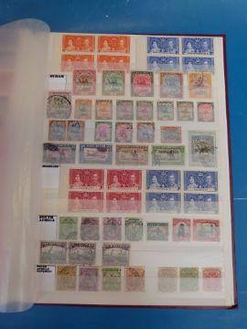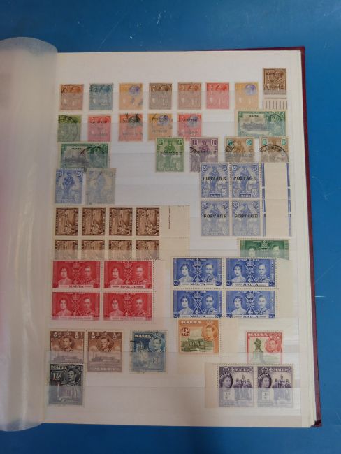 A red stockbook of GB and commonwealth stamps including many mint blocks of four 1937 coronation stamps