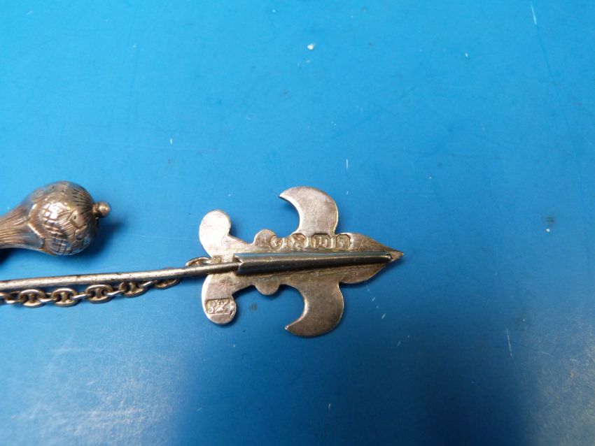 An unusual Victorian silver pin by Henry Ellis, the upper section in the form of a piece of lace with a buckle, the pin with safety chain and dropper leading to fleur de lys engraved detail. Exeter 1847 and HS Ellis, Exeter, Reg Oct 21 1847, length 13.5 cm