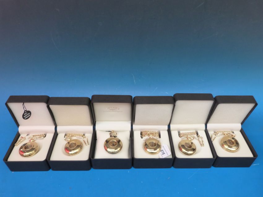 Eleven Rotary gold plated gents half hunter pocket watches on chains, each with skeleton movement and clear panel to the front and back of the case, and all in original boxes