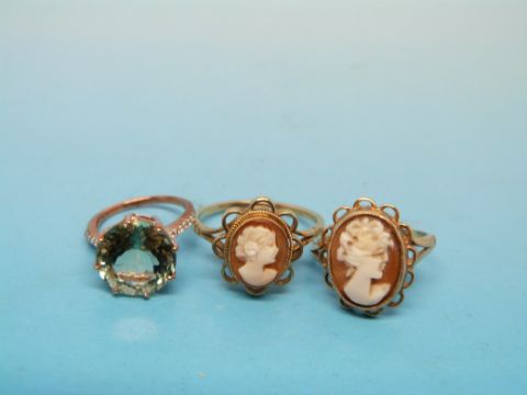 A 9ct gold cameo ring, a yellow metal cameo ring and a 9ct gold ring set with a large stone