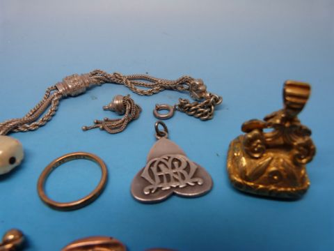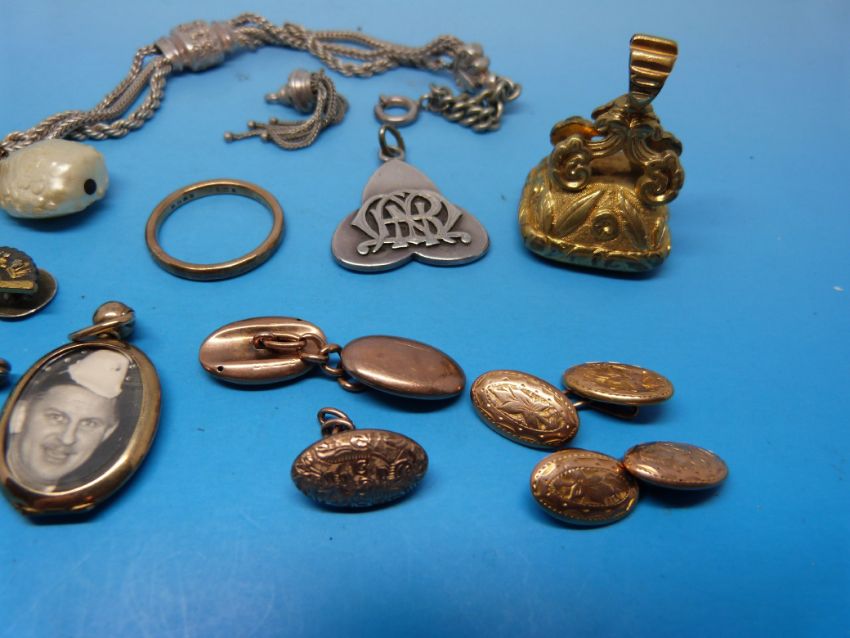 A pair of hallmarked 9ct gold cufflinks, a 9ct gold cufflink (6.5g), a hallmarked 9ct gold locket, an intaglio fob set with agate, a white metal fob with Isle of Man symbol to one side, white metal chatelaine etc
