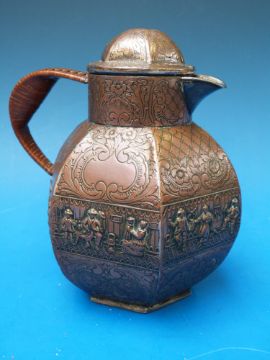 An Eastern jug, with copper finish and canework handle