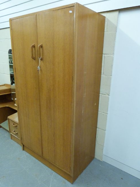 A G Plan retro light oak bedroom suite comprising dressing table (W122cm x D48cm x H140cm), chair and wardrobe (W92cm x D53cm x H176cm)