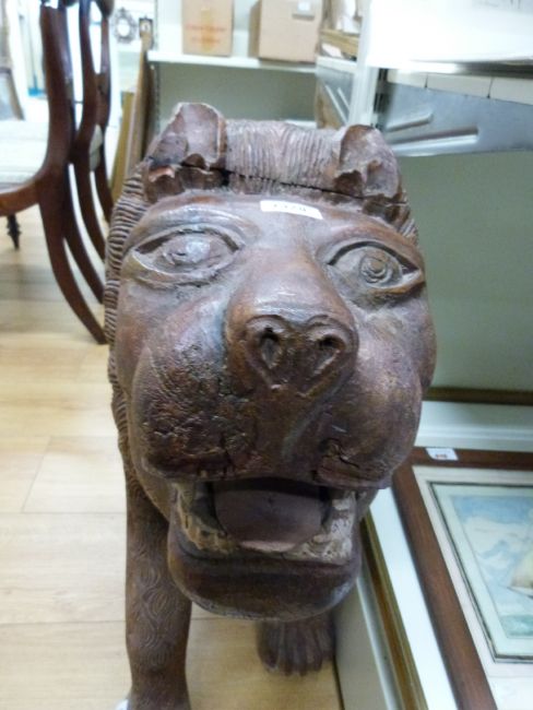A large wooden model of a lion