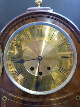 A large bracket clock with three train with hour glass, wing and scythe stamp to movement striking on a gong and a bell, the case with inlaid brass decoration and lion head handles raised on brass bun feet
