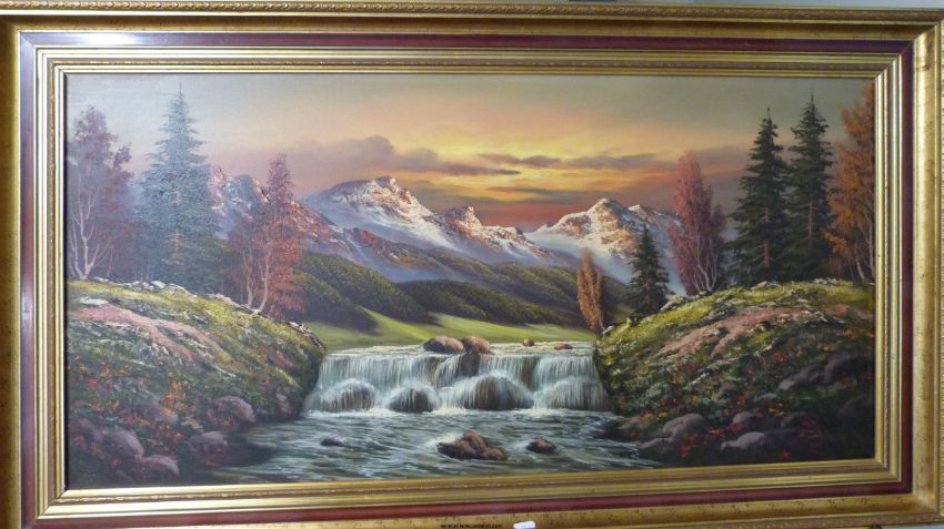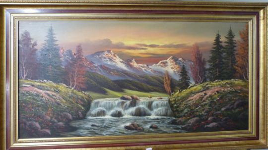 An oil on canvas of a river with waterfall in a mountainous landscape (48 x 98cm)