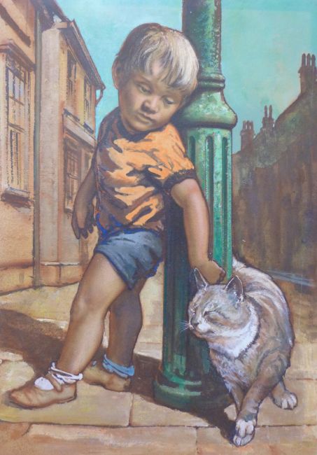 Joseph Henry Lynch (1911-1989): Watercolour / acrylic on board of a boy stroking a cat and leaning on a lamp post. Unsigned. (60cm x 42cm)