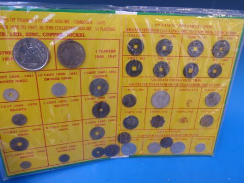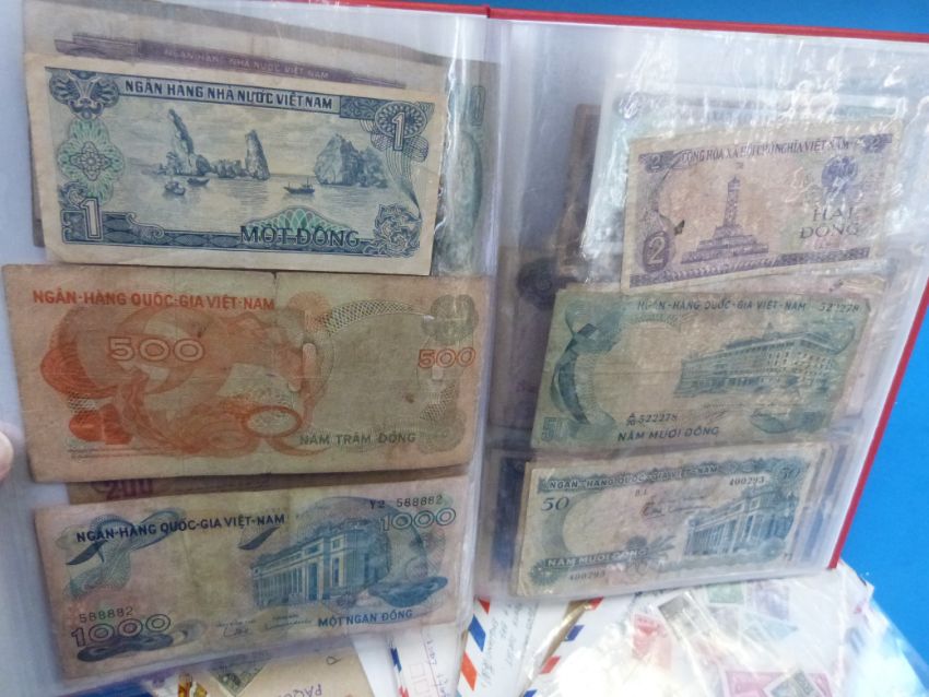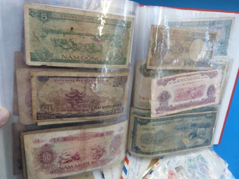 A collection of Chinese and Vietnamese bank notes, coins and stamps