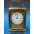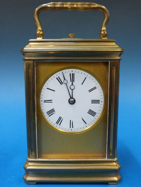 A gilt cased repeater carriage clock with white enamel dial, striking on a gong