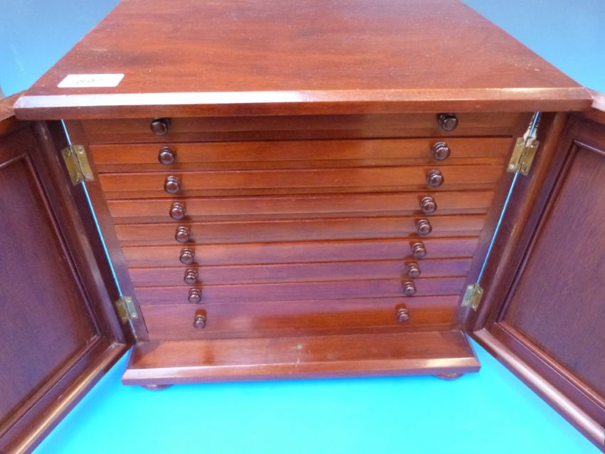 A mahogany coin collectors cabinet with eight shallow (one deeper) drawers with key