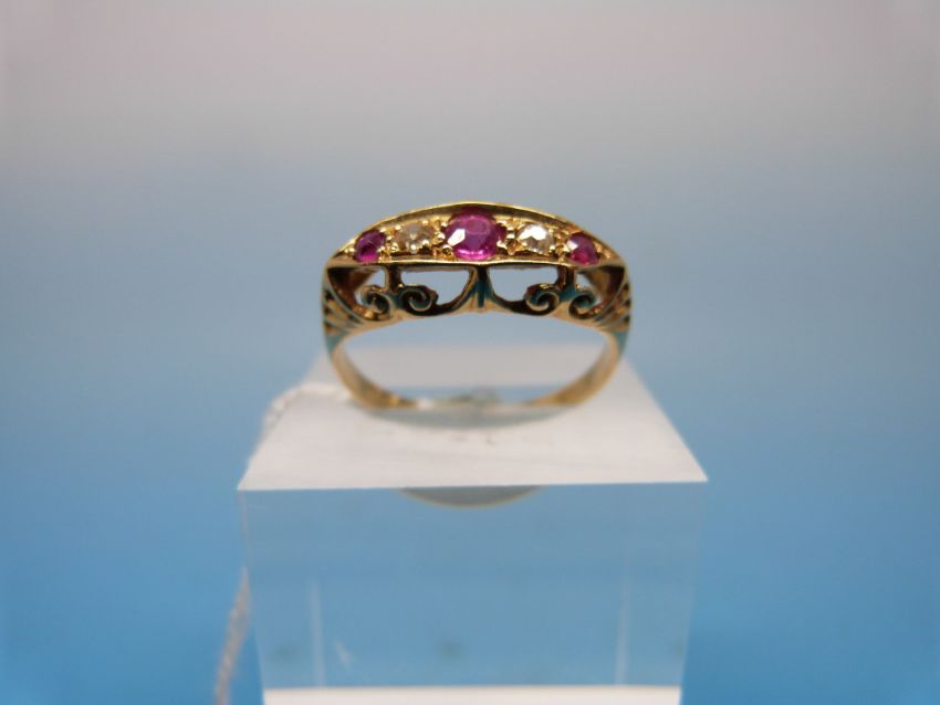 An 18ct gold ring set with three rubies with alternating diamonds (size R)
