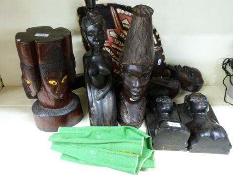 A collection of African carvings including statues, table lamps etc