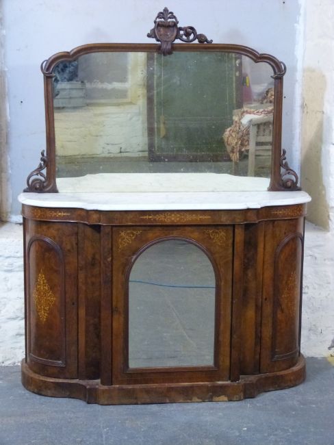 A 19thC walnut inlaid credenza with marble top and mirror back (width 132cm, depth 40cm, height 165cm)