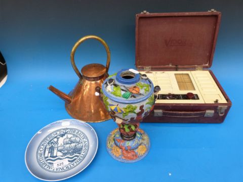A Vidor c1950 portable radio, relief moulded lamp base, copper kettle, Copenhagen plate