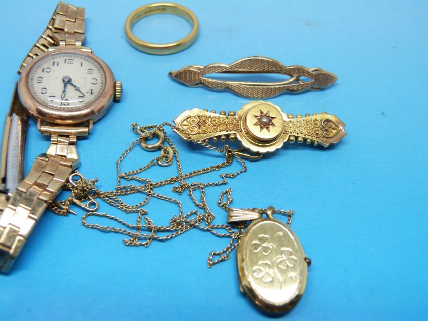 A 22ct gold wedding band (6g), a yellow metal brooch marked 9ct (2.6g), a 15ct gold brooch set with a pearl, a yellow metal locket and chain and a gold cased ladies wristwatch