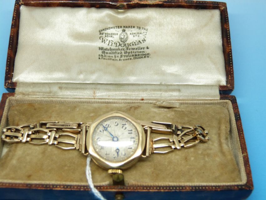 A 9ct gold ladies wristwatch on 9ct gold strap (14.5g)