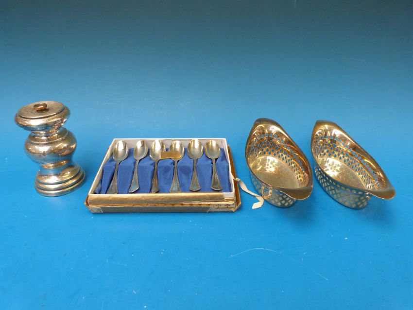 A pair of hallmarked silver pierced oval dishes (16cm long, 130g) together with a set of white metal spoons stamped 800 (30g) and a hallmarked silver pepper mill