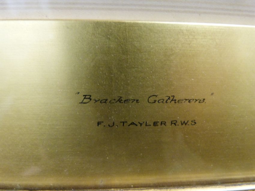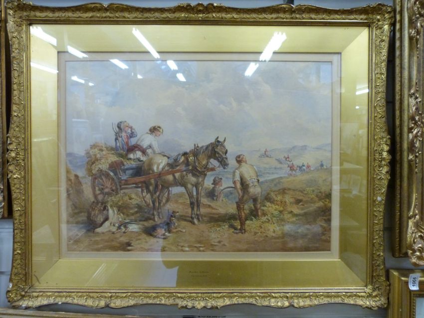 John Frederick Taylor (1802-1889) RWS: Watercolour "Bracken Gatherers" with figures, cart and dog to foreground and hunt to background. Monogrammed F T and dated 1875 lower left, in ornate gilt and glazed frame, 43cm x 60cm