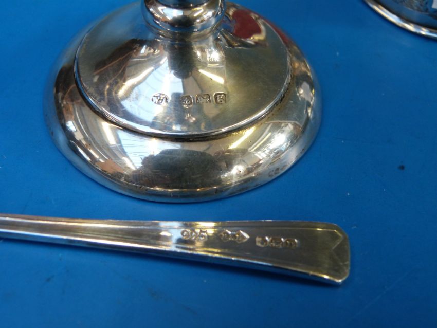 A cased set of six hallmarked silver teaspoons with five various napkin rings, 146g, together with a silver trumpet vase