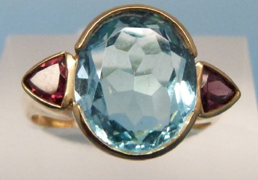 A 9ct gold ring set with an aquamarine flanked by garnets (size N)