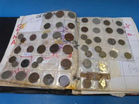 A blue coin collector's album of world coinage including Germany, UK, Denmark, Channel Island, Italy, Malaysia, China etc.