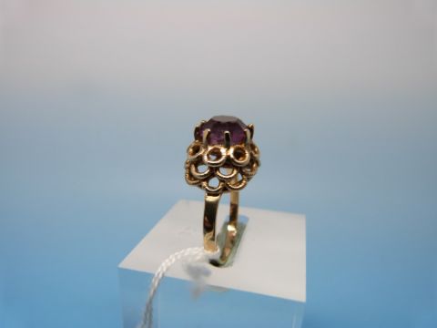 A 9ct gold ring set with a large amethyst in a circular design setting (size M)