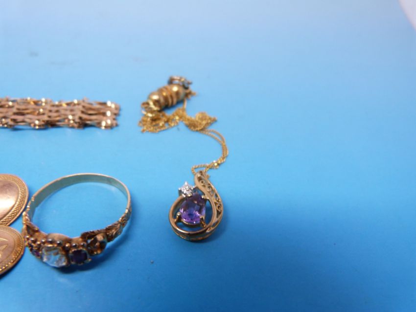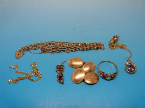 A 9ct gold gate bracelet with yellow metal padlock clasp marked 375, yellow metal bracelet marked 375, hallmarked 9ct gold cufflinks (8.9g), 9ct gold amethyst and diamond pendant on yellow metal chain and an Edwardian yellow metal ring set with a clear stone flanked with two rubies