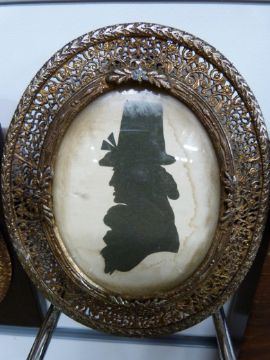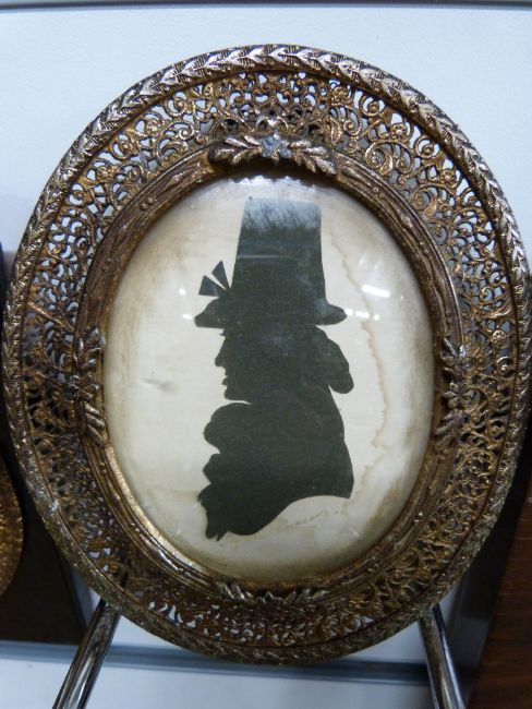 Two 19thC silhouettes in gilded pierced frames, both indistinctly named together with a brass picture frame