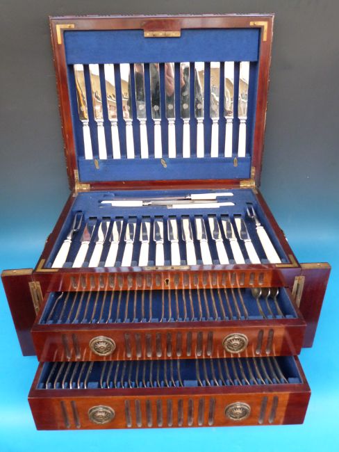A Selfridge Sheffield plate 12-place setting canteen of cutlery in mahogany fitted case with Wellington chest type lock