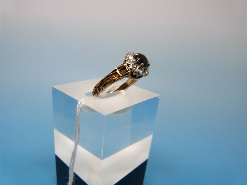A 9ct gold ring set with a central sapphire surrounded by diamonds in a flower cluster (size J)