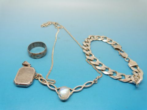A white metal locket, bracelet, necklace set with a moonstone and a ring, all marked 925