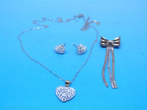 A 9ct gold heart shaped necklace and matching earrings and a 9ct gold tricolour bow brooch