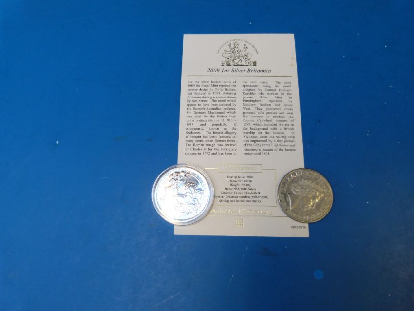 Two silver Britannia coins, one for 2004 and one 2009 example in capsule