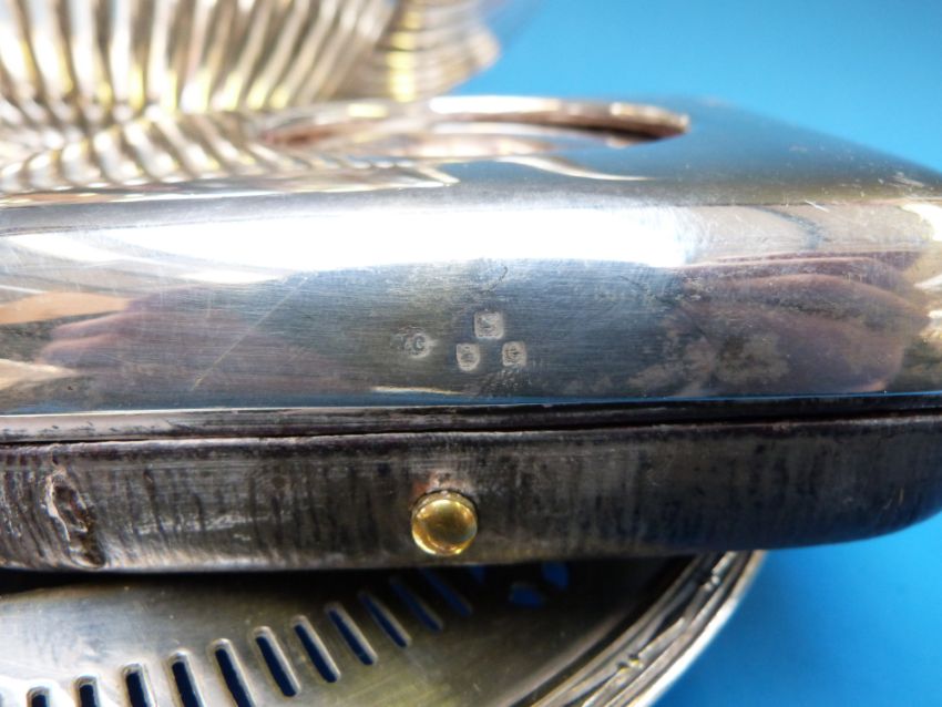 A hallmarked silver photograph frame to suit 6 x 4 photo, a silver-cased watch holder with Goliath pocket watch inside, plated tray and teapot