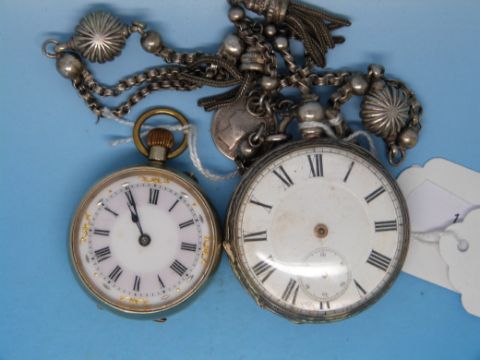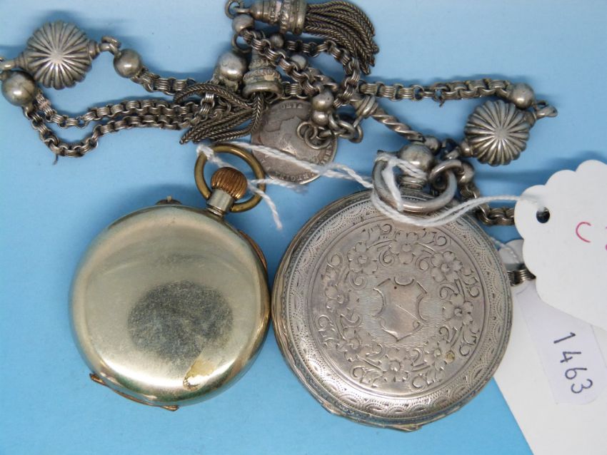 A ladies' keyless fob watch together with a silver cased example on chatelaine chain