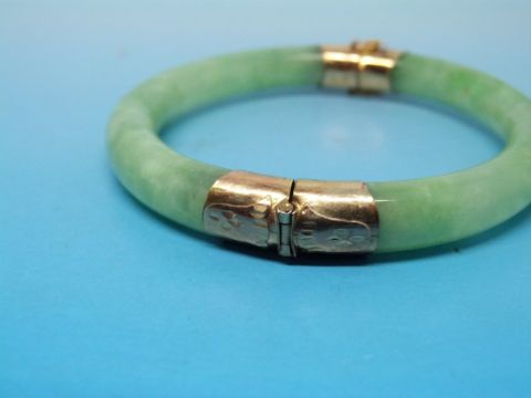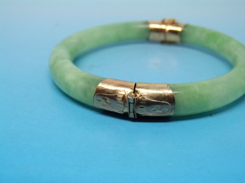 A jade or jadeite bangle with hinged yellow metal mounts and clasp