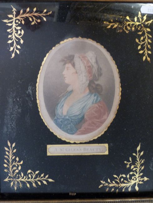Two coloured prints 'A St Giles Beauty' and a 'St James Beauty' in a Verre Eglomise mount, each approx 39cm x 31cm overall