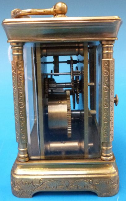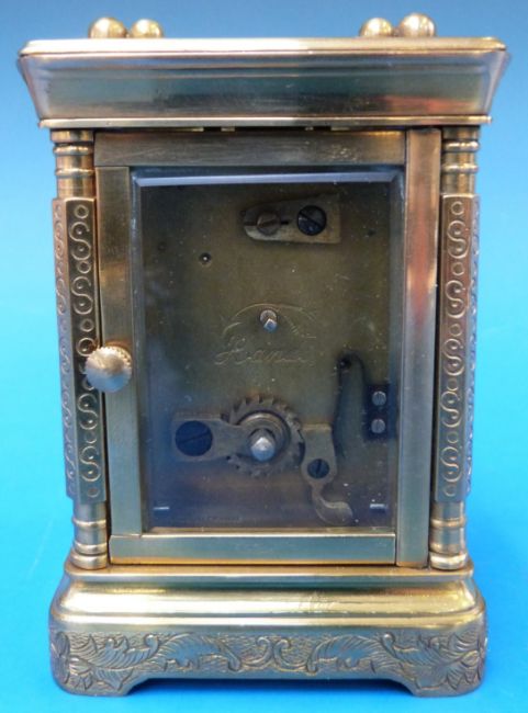 A small French carriage timepiece, Elliot and Sons London to dial, ornate pillars to case