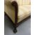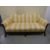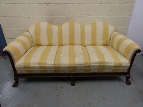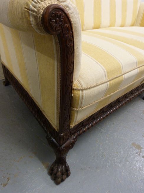 A carved walnut three piece suite raised on ball and claw feet and comprising three seater sofa and two armchairs all upholstered in yellow and cream striped fabric
