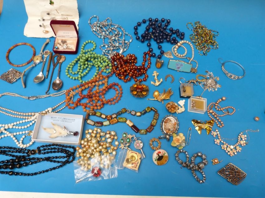 A collection of costume jewellery including an R.A.F. sweetheart brooch, silver items, beads etc