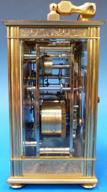 A c1900 French carriage clock with striking movement marked "France", gilt case with chased decoration, white enamel dial with Roman numerals, sub-dial with Arabic numerals and five glass bejewelled panels