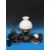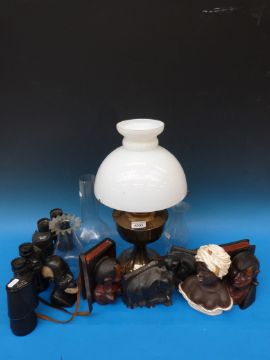 A brass and glass oil lamp together with two pairs of binoculars and African carvings etc