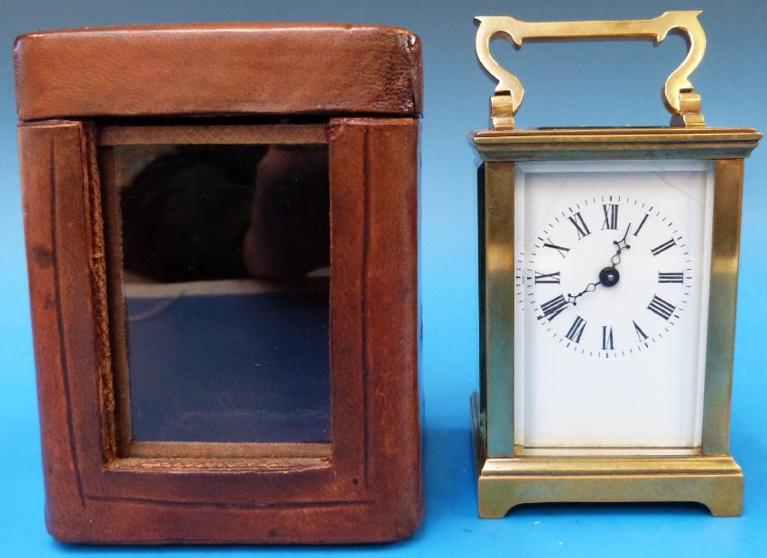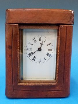 A small French carriage clock in original leather carry case