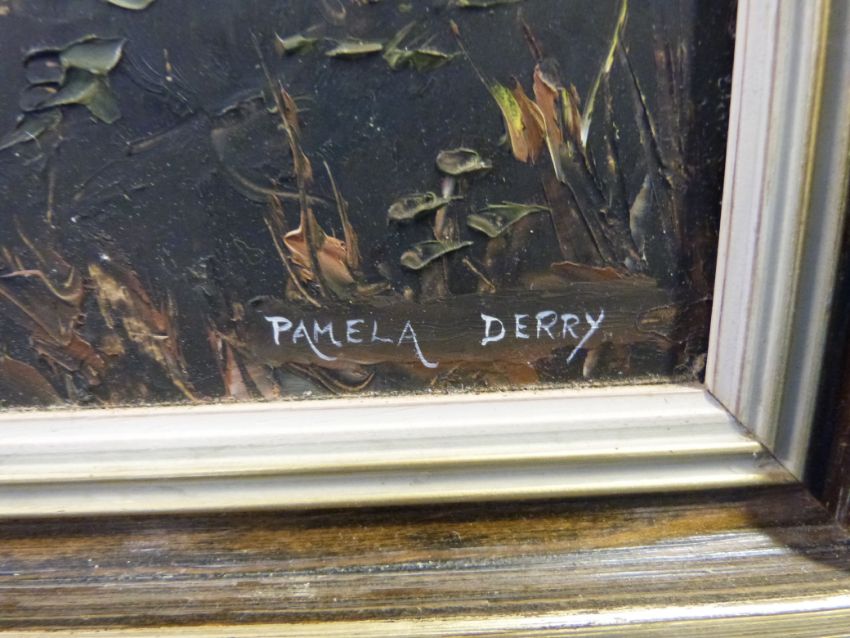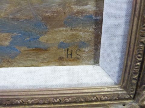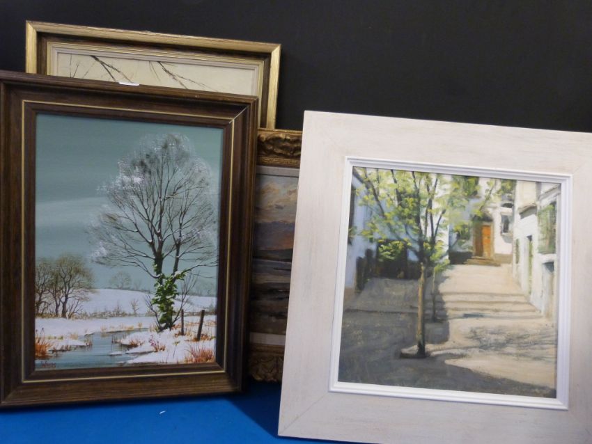 Harold Swanwick: Oil on canvas of sunset over beach, 25cm x 35cm, together with oil on canvas of a winter stream, Pamela Derry, and a plaza scene