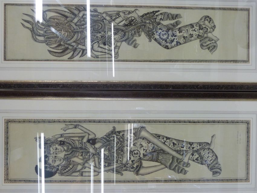 Two Balinese pictures on silk of dancers (88 x 20cm)